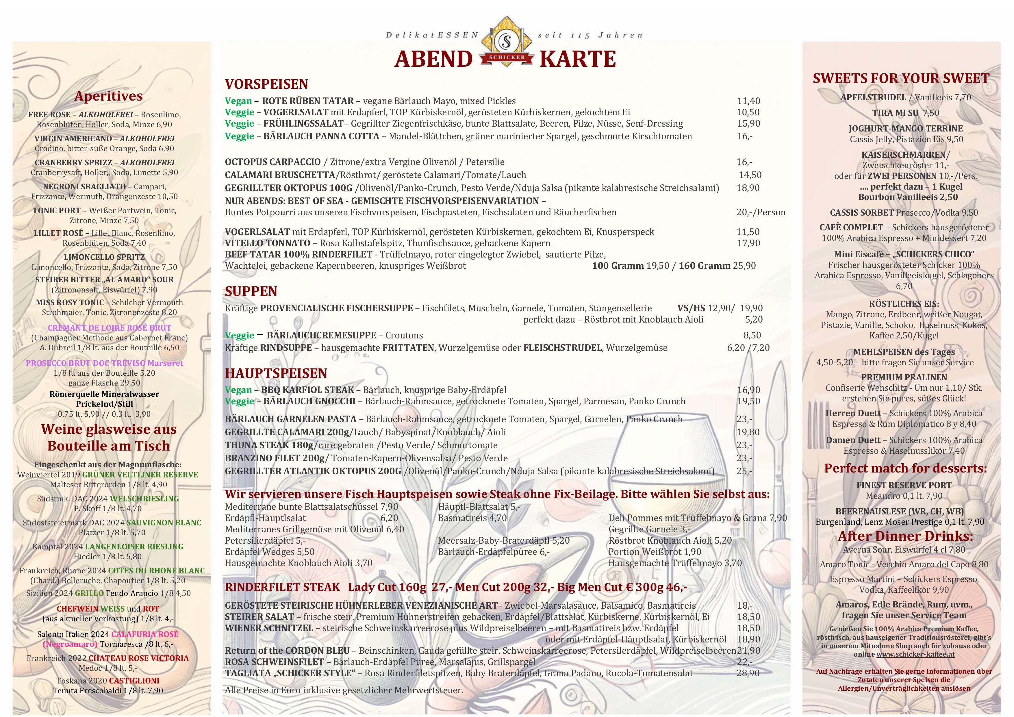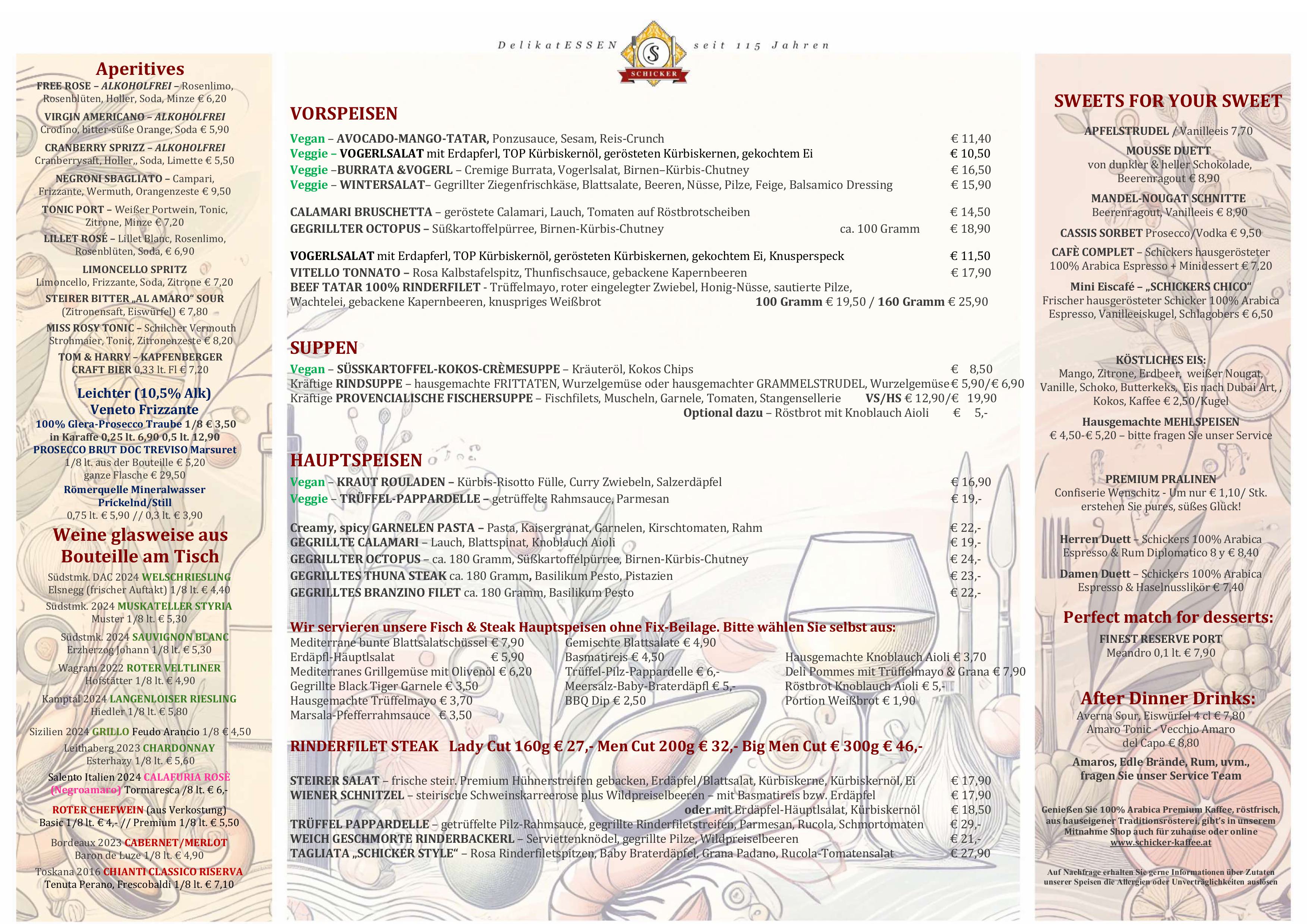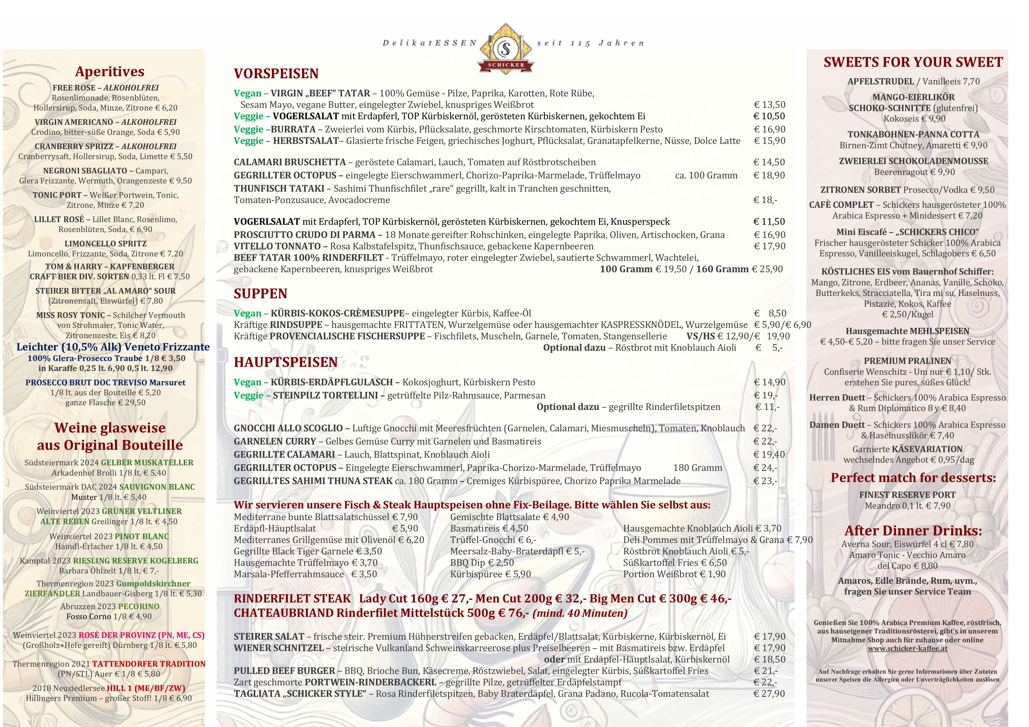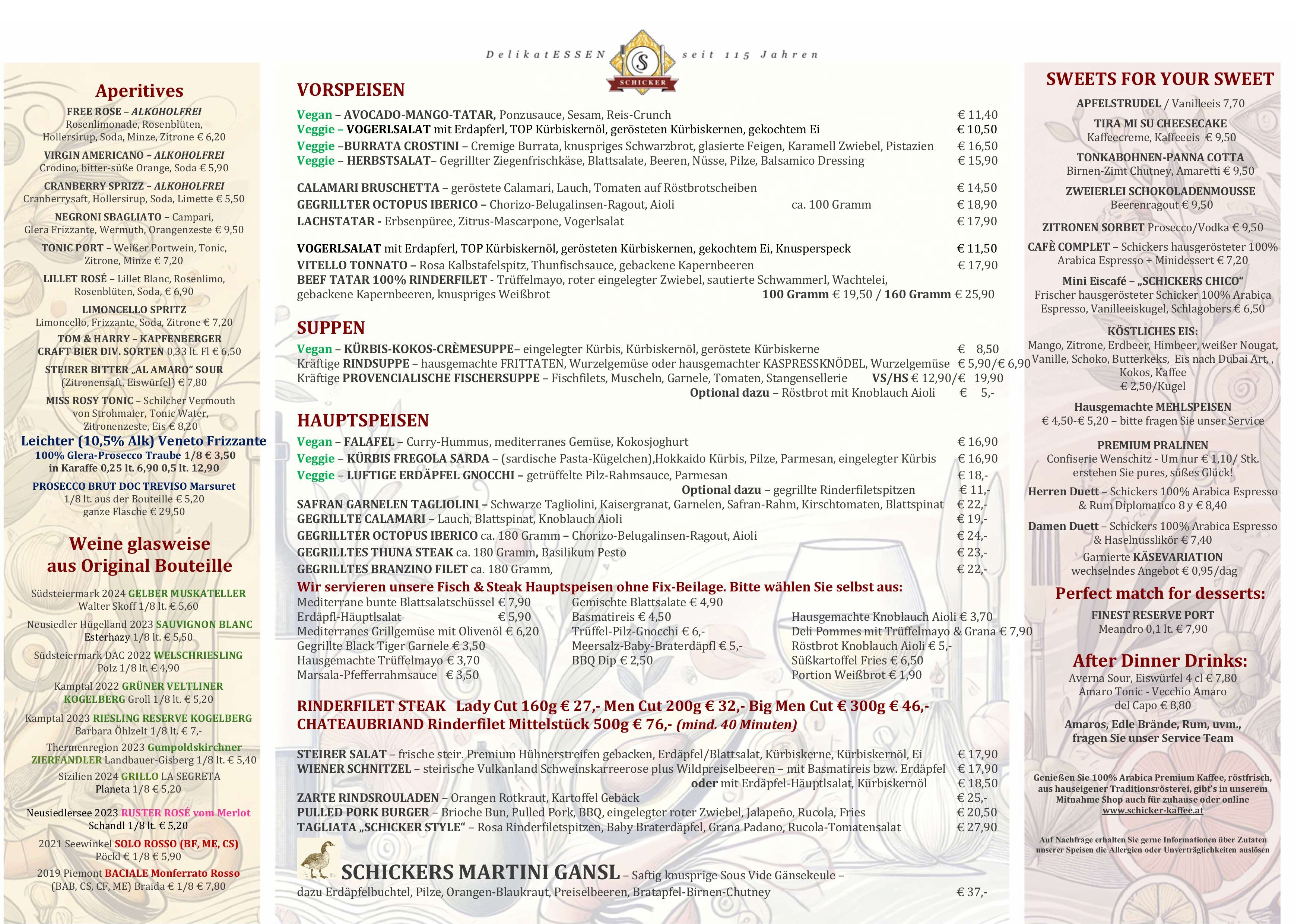 Frisch und geradlinig kochen – von klassisch bis trendig – mediterrane Leichtigkeit, immer mit hochwertigen Lebensmitteln. Vegetarisches wird ernst genommen, für köstliche Fischküche kennt man den Schicker weithin und die „österreichische“ Klassik sowie fleischliche Genüsse kommen nicht zu kurz. Zusätzlich zur Karte bieten wir 3 Mittagsmenüs und Tagesangebote. Mittendrin die 350-400 Sorten Vinothek für freudvollen Genuss.