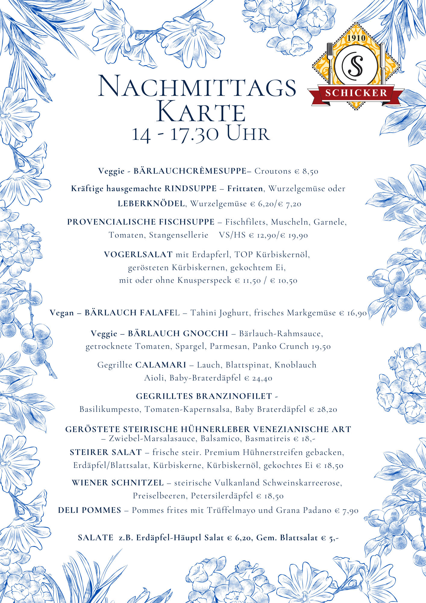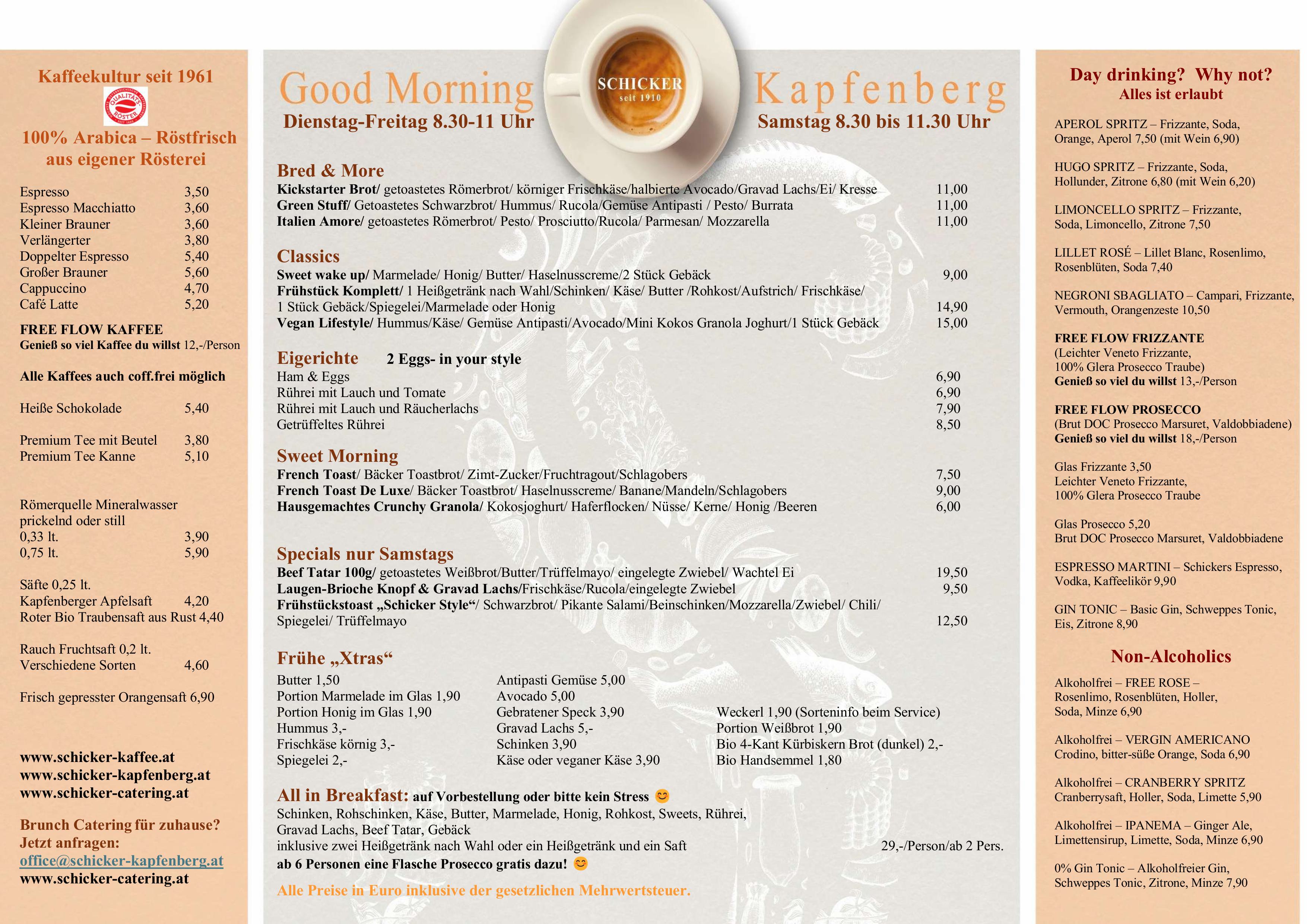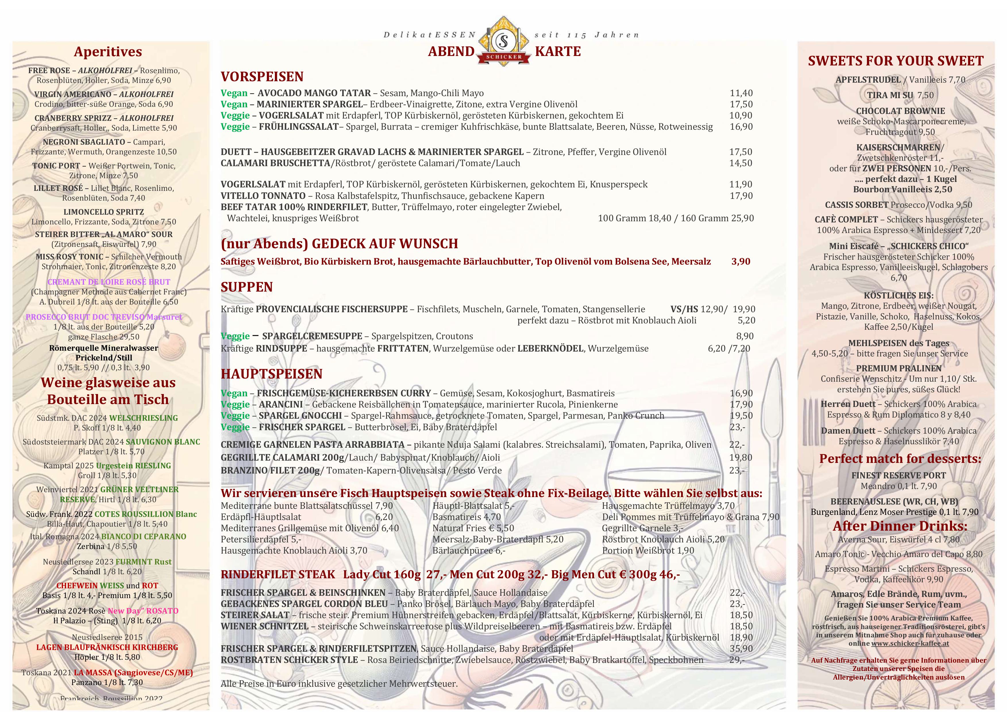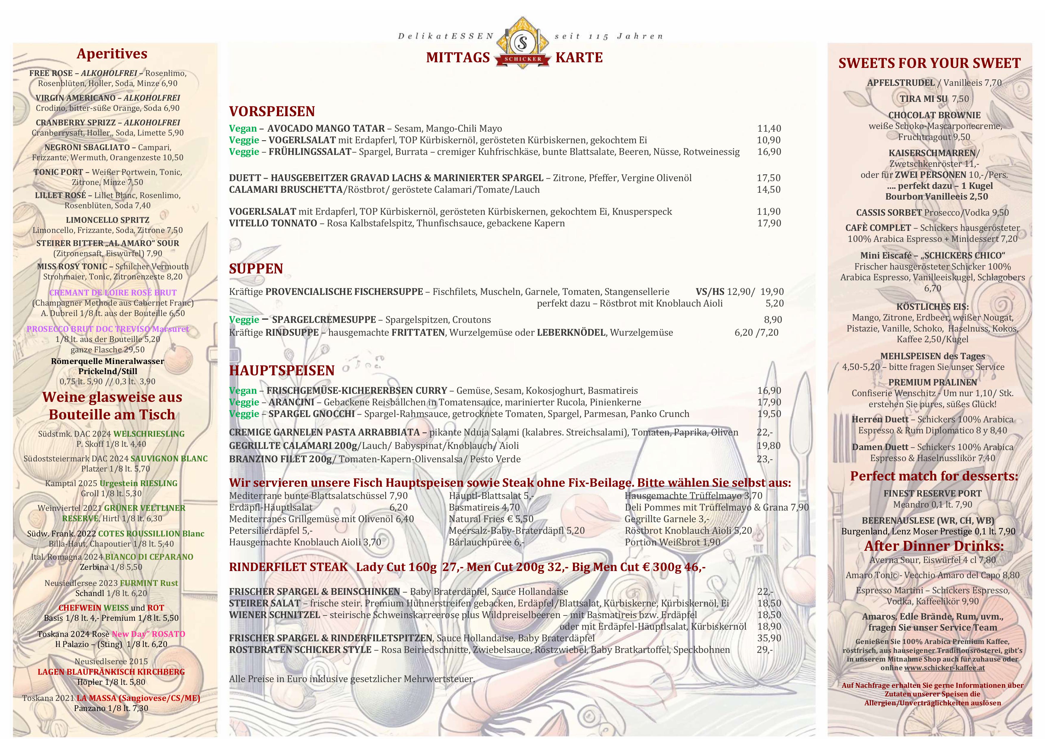 Frisch und geradlinig kochen – von klassisch bis trendig – mediterrane Leichtigkeit, immer mit hochwertigen Lebensmitteln. Vegetarisches wird ernst genommen, für köstliche Fischküche kennt man den Schicker weithin und die „österreichische“ Klassik sowie fleischliche Genüsse kommen nicht zu kurz. Zusätzlich zur Karte bieten wir 3 Mittagsmenüs und Tagesangebote. Mittendrin die 350-400 Sorten Vinothek für freudvollen Genuss.