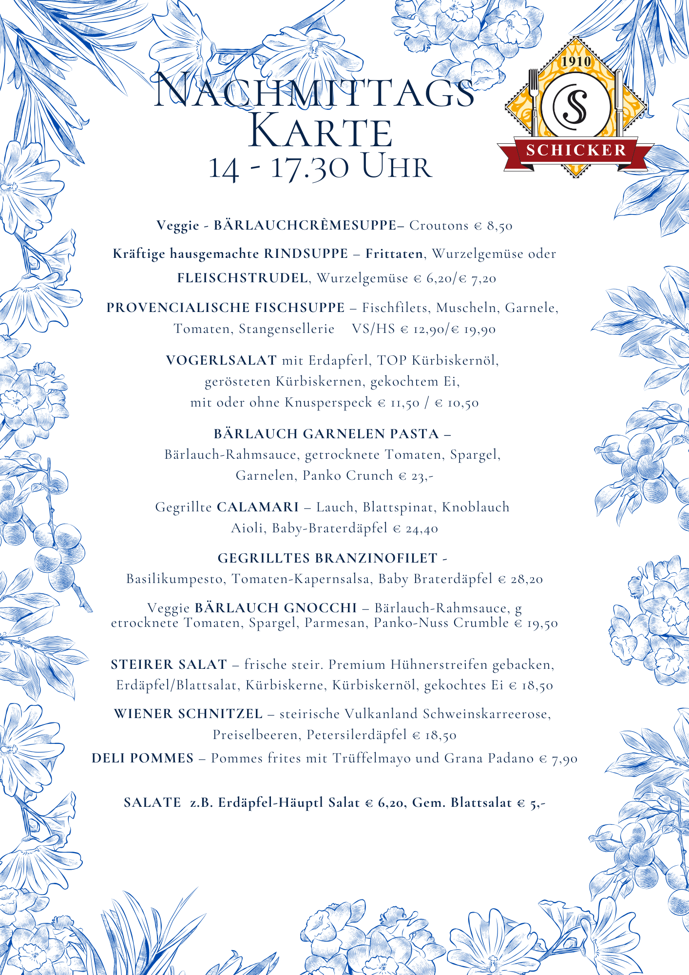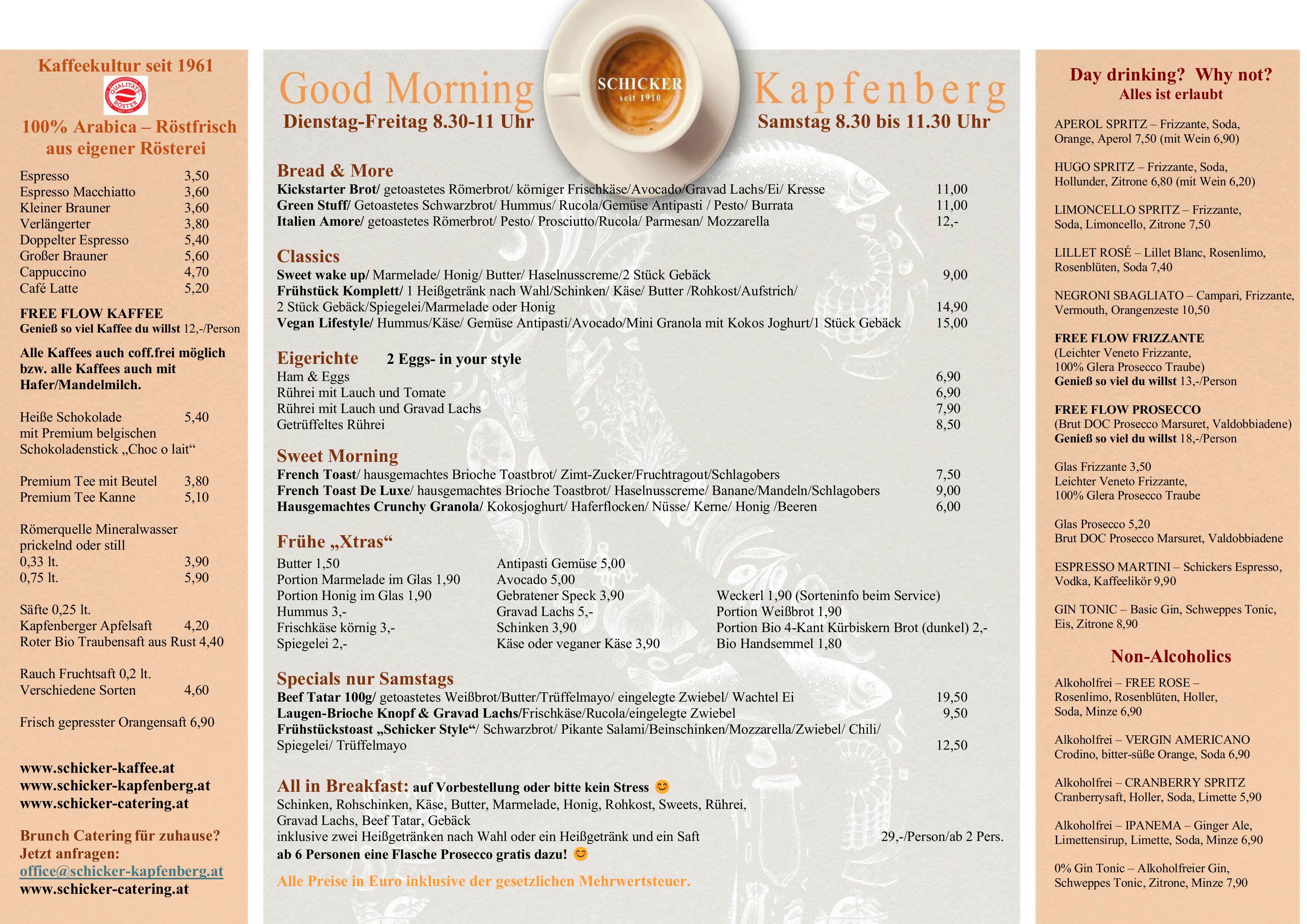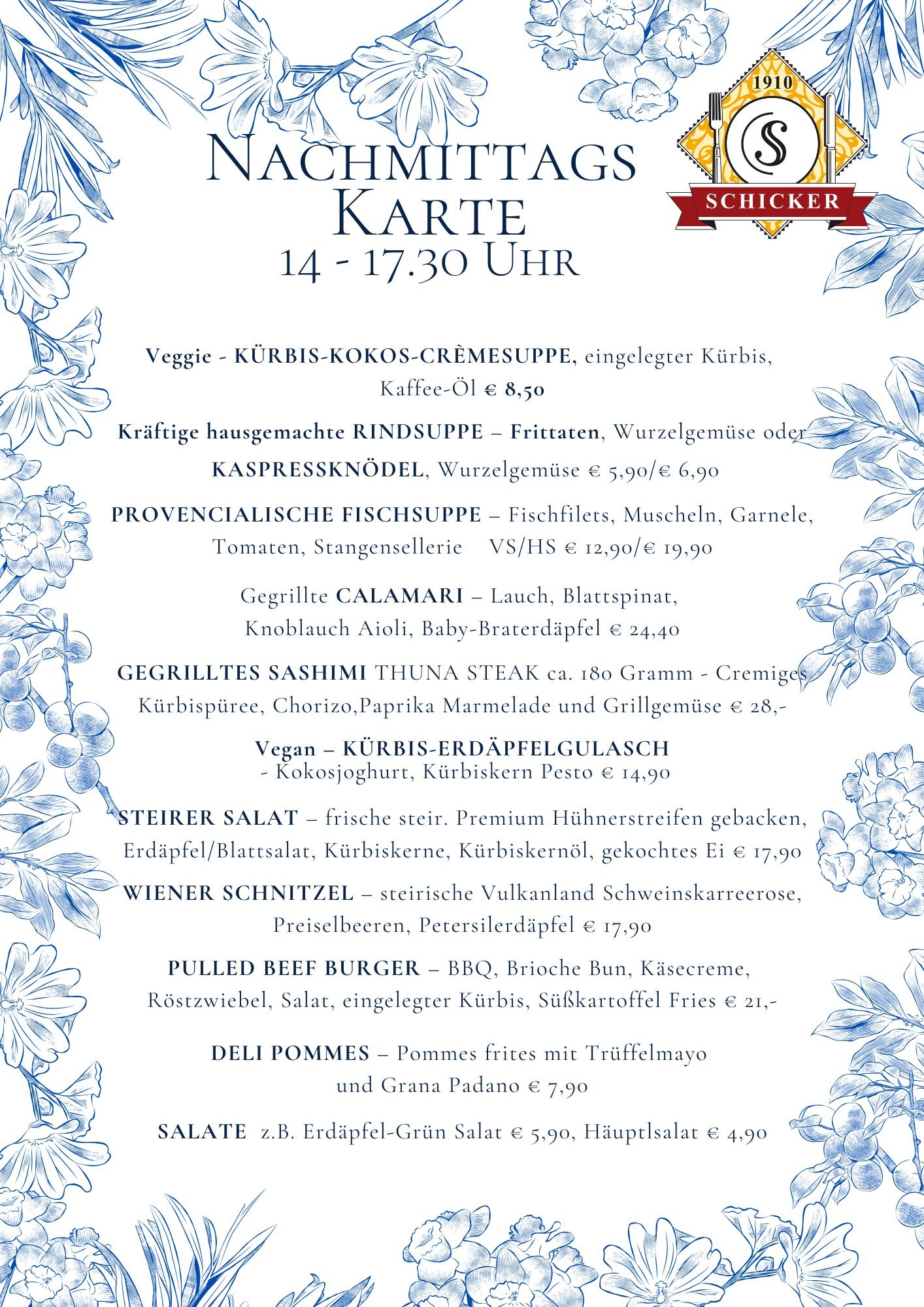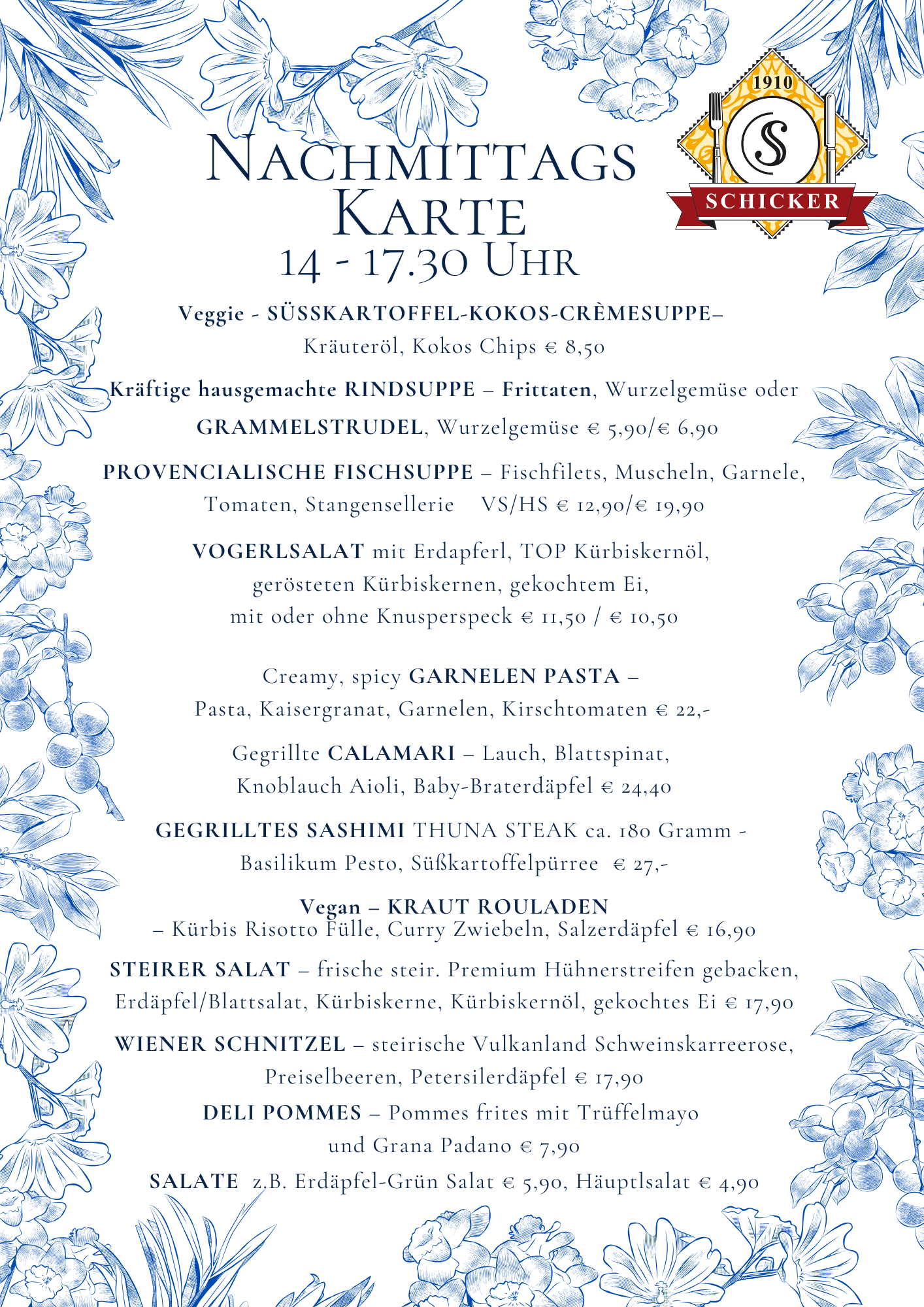 Frisch und geradlinig kochen – von klassisch bis trendig – mediterrane Leichtigkeit, immer mit hochwertigen Lebensmitteln. Vegetarisches wird ernst genommen, für köstliche Fischküche kennt man den Schicker weithin und die „österreichische“ Klassik sowie fleischliche Genüsse kommen nicht zu kurz. Zusätzlich zur Karte bieten wir 3 Mittagsmenüs und Tagesangebote. Mittendrin die 350-400 Sorten Vinothek für freudvollen Genuss.